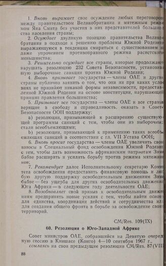 Девятая очередная сессия Совета министров. CM/Res. 109 (IX). Резолюция о Юго-Западной Африке. Киншаса, 4-10 сентября 1967 г. // «OAU Secretariat. Resolutions adopted by the Council; of Ministers at Its Ninth Ordinary Session and approved by the Fourth Ordinary Session of the Assembly of Heads of State and Government», Addis Ababa, 1967.