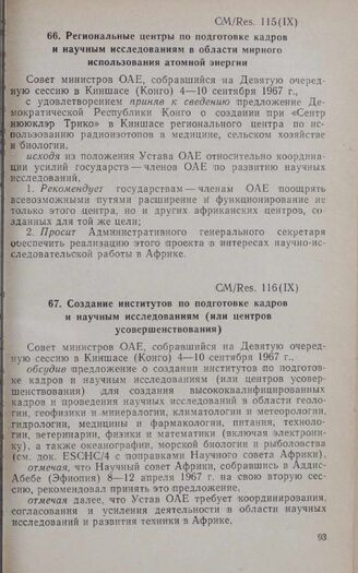 Девятая очередная сессия Совета министров. CM/Res. 116 (IX). Создание институтов по подготовке кадров и научным исследованиям (или центров усовершенствования). Киншаса, 4-10 сентября 1967 г. // «OAU Secretariat. Resolutions adopted by the Council; of Ministers at Its Ninth Ordinary Session and approved by the Fourth Ordinary Session of the Assembly of Heads of State and Government», Addis Ababa, 1967.