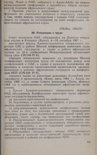 Девятая очередная сессия Совета министров. CM/Res. 129 (IX). Резолюция о труде. Киншаса, 4-10 сентября 1967 г. // «OAU Secretariat. Resolutions adopted by the Council; of Ministers at Its Ninth Ordinary Session and approved by the Fourth Ordinary Session of the Assembly of Heads of State and Government», Addis Ababa, 1967.