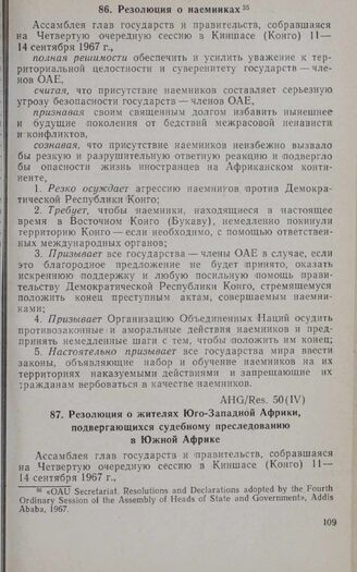 Четвертая очередная сессия Ассамблеи глав государств и правительств. Резолюция о наемниках. Киншаса, 11-14 сентября 1967 г. // «OAU Secretariat. Resolutions and Declarations adopted by the Fourth Ordinary Session of the Assembly of Heads of State and Government», Addis Ababa, 1967.