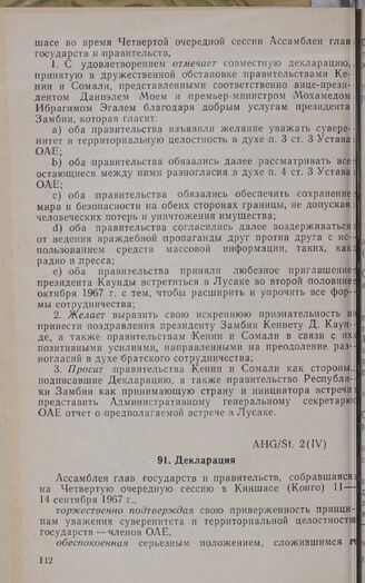 Четвертая очередная сессия Ассамблеи глав государств и правительств. AiHG/St. 2 (IV). Декларация. Киншаса, 11-14 сентября 1967 г. // «OAU Secretariat. Resolutions and Declarations adopted by the Fourth Ordinary Session of the Assembly of Heads of State and Government», Addis Ababa, 1967.