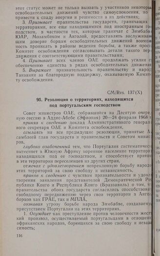 Десятая очередная сессия Совета министров. CM/Res. 137(Х). Резолюция о территориях, находящихся под португальским господством. Аддис-Абеба, 20-24 февраля 1968 г. // «OAU Secretariat. Resolutions adopted by the Tenth Ordinary Session of the Council of Ministers», Addis Ababa, 1968.