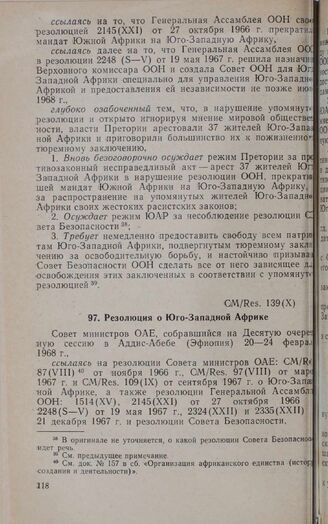 Десятая очередная сессия Совета министров. CM/Res. 139(Х). Резолюция о Юго-Западной Африке. Аддис-Абеба, 20-24 февраля 1968 г. // «OAU Secretariat. Resolutions adopted by the Tenth Ordinary Session of the Council of Ministers», Addis Ababa, 1968.