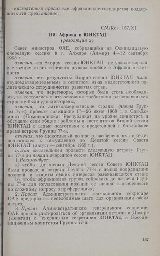 Одиннадцатая очередная сессия Совета министров. CM/Res. 157 (ХІ). Африка и ЮНКТАД (резолюция 2). Алжир, 4-12 сентября 1968 г. // «OAU Secretariat. Resolutions adopted by the Eleventh Session of the Council of Ministers», Addis Ababa, 1968.