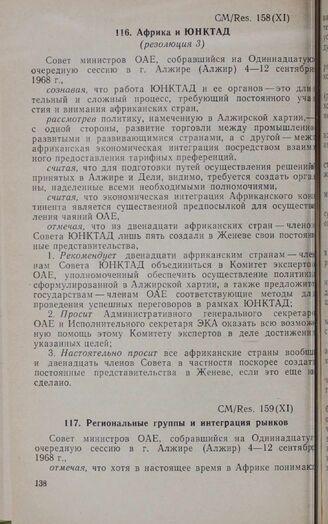 Одиннадцатая очередная сессия Совета министров. CM/Res. 159 (ХІ). Региональные группы и интеграция рынков. Алжир, 4-12 сентября 1968 г.