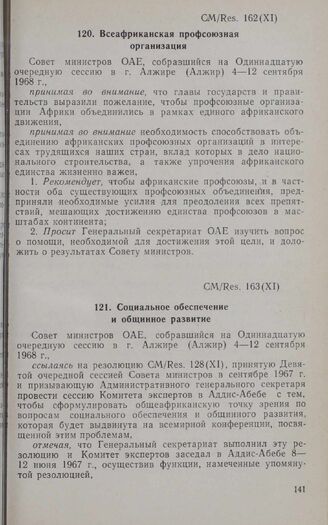 Одиннадцатая очередная сессия Совета министров. CM/Res. 163 (XI). Социальное обеспечение и общинное развитие. Алжир, 4-12 сентября 1968 г. // «OAU Secretariat. Resolutions adopted by the Eleventh Session of the Council of Ministers», Addis Ababa, 1968.