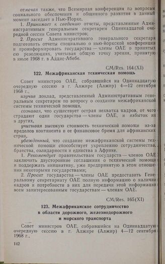 Одиннадцатая очередная сессия Совета министров. CM/Res. 165 (XI). Межафриканское сотрудничество в области дорожного, железнодорожного и морского транспорта. Алжир, 4-12 сентября 1968 г. // «OAU Secretariat. Resolutions adopted by the Eleventh Session of the Council of Ministers», Addis Ababa, 1968.