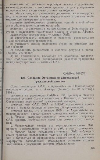 Одиннадцатая очередная сессия Совета министров. CM/Res. 166 (XI). Создание Организации африканской гражданской авиации. Алжир, 4-12 сентября 1968 г. // «OAU Secretariat. Resolutions adopted by the Eleventh Session of the Council of Ministers», Addis Ababa, 1968.