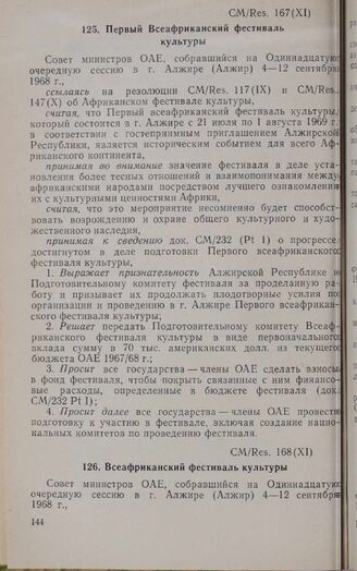 Одиннадцатая очередная сессия Совета министров. CM/Res. 168 (XI). Всеафриканский фестиваль культуры. Алжир, 4-12 сентября 1968 г. // «OAU Secretariat. Resolutions adopted by the Eleventh Session of the Council of Ministers», Addis Ababa, 1968.