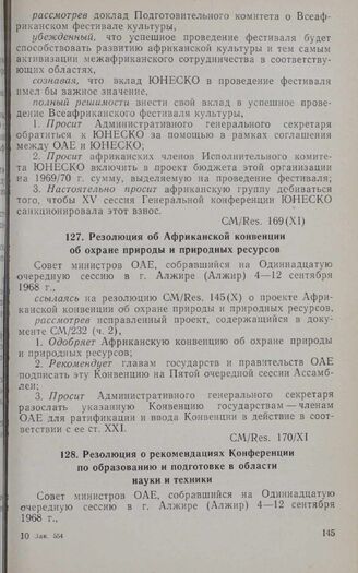 Одиннадцатая очередная сессия Совета министров. CM/Res. 169 (XI). Резолюция об Африканской конвенции об охране природы и природных ресурсов. Алжир, 4-12 сентября 1968 г.