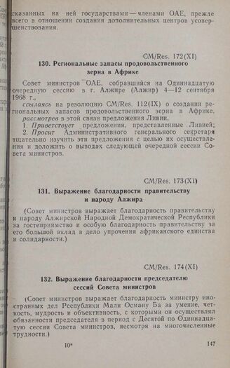 Одиннадцатая очередная сессия Совета министров. CM/Res. 173 (XI). Выражение благодарности правительству и народу Алжира. Алжир, 4-12 сентября 1968 г.