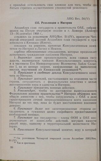 Пятая очередная сессия Ассамблеи глав государств и правительств. AHG Res. 54 (V). Резолюция о Нигерии. Алжир, 13-16 сентября 1968 г. // «OAU Secretariat. Resolutions adopted by the Fifth Assembly of Heads of State and Government», Algiers, 1968.