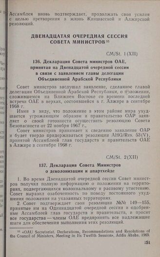 Двенадцатая очередная сессия Совета министров. CM/St. 1 (XII). Декларация Совета министров ОАЕ, принятая на Двенадцатой очередной сессии в связи с заявлением главы делегации Объединенной Арабской Республики. Аддис-Абеба, 17-22 февраля 1969 г.