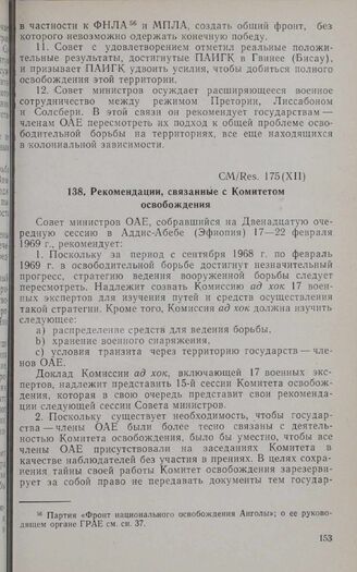 Двенадцатая очередная сессия Совета министров. CM/Res. 175 (XII). Рекомендации, связанные с Комитетом освобождения. Аддис-Абеба, 17-22 февраля 1969 г. // «OAU Secretariat. Declarations, Recommendations and Resolutions of the Council of Ministers, Meeting in Its Twelfth Session», Addis Ababa, 1969.