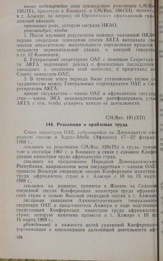 Двенадцатая очередная сессия Совета министров. CM/Res. 181 (XII). Резолюция о проблемах труда. Аддис-Абеба, 17-22 февраля 1969 г. // «OAU Secretariat. Declarations, Recommendations and Resolutions of the Council of Ministers, Meeting in Its Twelfth Session», Addis Ababa, 1969.