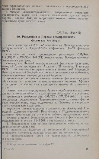 Двенадцатая очередная сессия Совета министров. CM/Res. 186 (XII). Резолюция о Первом всеафриканском фестивале культуры. Аддис-Абеба, 17-22 февраля 1969 г.