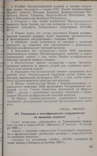Тринадцатая очередная сессия Совета министров. CM/Res. 198 (XIII). Резолюция о межафриканском сотрудничестве по правовым вопросам. Аддис-Абеба, 27 августа-6 сентября 1969 г. // «OAU Secretariat. Resolutions adopted by the Thirteenth Ordinary Session of the Council of Ministers», Addis Ababa, 1969.