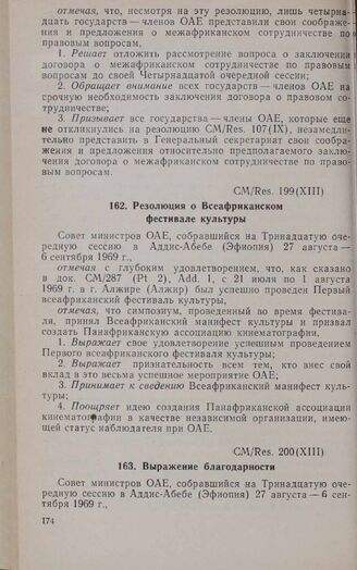 Тринадцатая очередная сессия Совета министров. CM/Res. 200 (XIII). Выражение благодарности. Аддис-Абеба, 27 августа-6 сентября 1969 г. // «OAU Secretariat. Resolutions adopted by the Thirteenth Ordinary Session of the Council of Ministers», Addis Ababa, 1969.