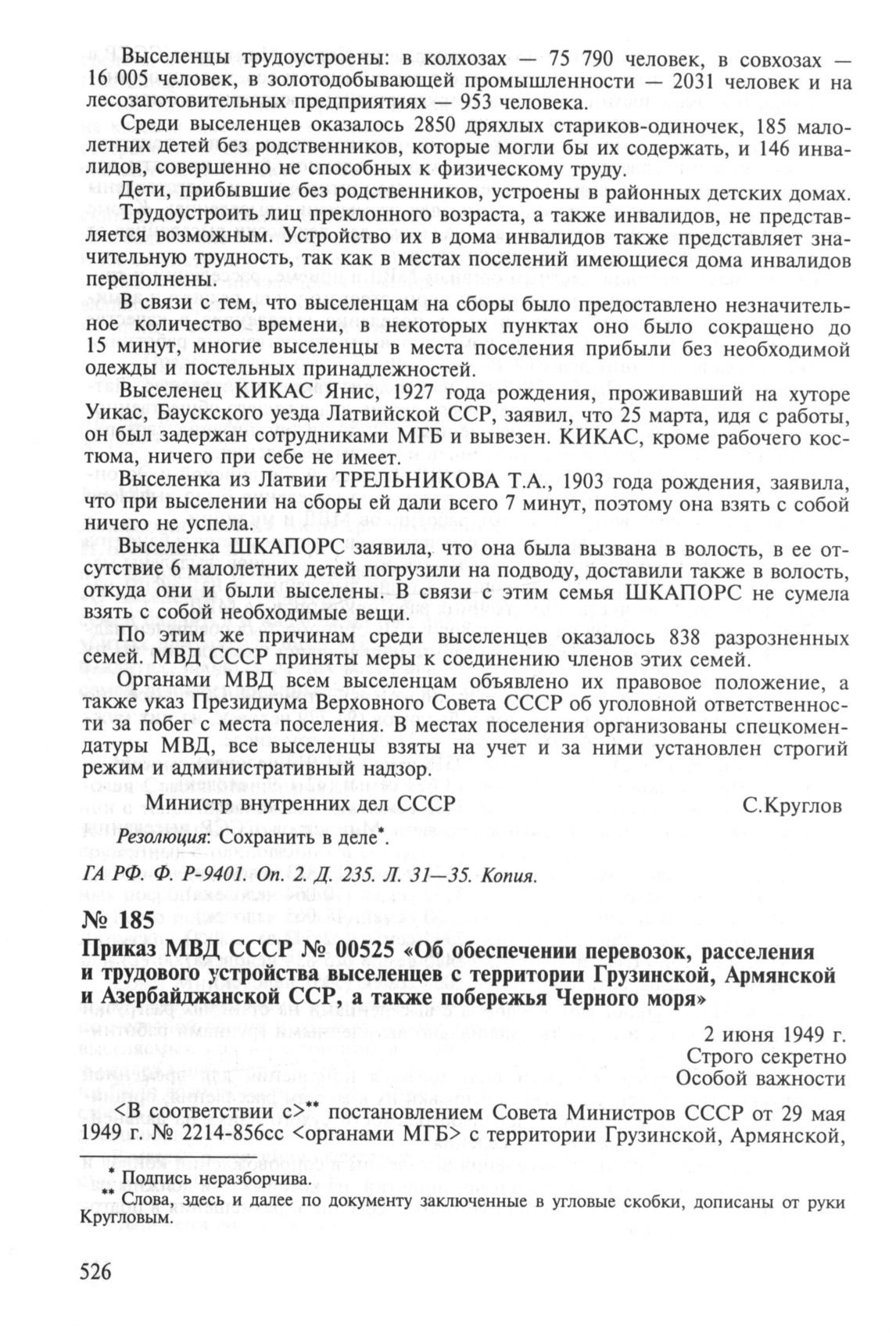 Приказ МВД СССР № 00525 «Об обеспечении перевозок, расселения и трудового устройства выселенцев с территории Грузинской, Армянской и Азербайджанской ССР, а также побережья Черного моря». 2 июня 1949 г. // ГА РФ. Ф. P-9401. Oп. 2. Д. 10. Л. 46—53. Подлинник.