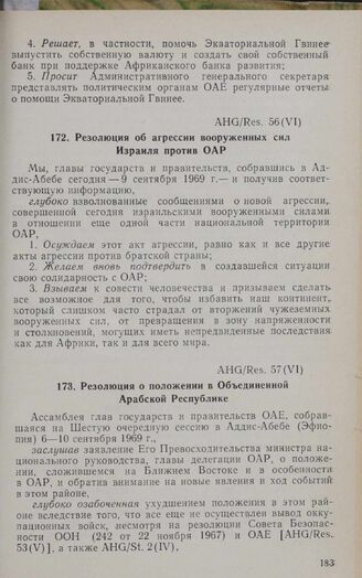 Шестая очередная сессия Ассамблеи глав государств и правительств. AHG/Res. 56 (VI). Резолюция об агрессии вооруженных сил Израиля против ОАР. Аддис-Абеба, 6-10 сентября 1969 г. // «OAU Secretariat. Resolutions adopted by the Assembly of Heads of State and Government in Its Sixth Ordinary Session», Addis Ababa, 1969.