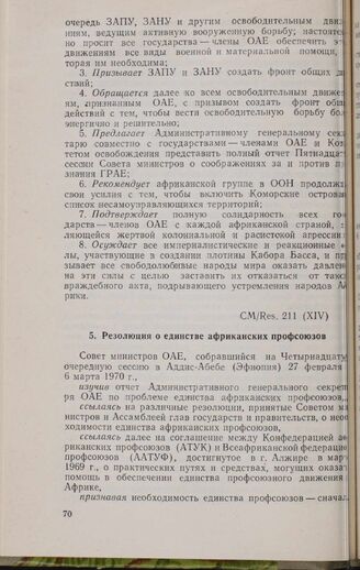 Четырнадцатая очередная сессия Совета министров. CM/Res. 211 (XIV). Резолюция о единстве африканских профсоюзов. Аддис-Абеба, 27 февраля-6 марта 1970 г. // «OAU Secretariat. Resolutions, Recommendations and Statements adopted by the Ordinary and Extra-ordinary Sessions of the Council of Ministers (1968-1973)», vol. 2, Addis Ababa, 1973, стр. 85-101.
