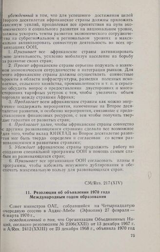 Четырнадцатая очередная сессия Совета министров. CM/Res. 217(XIV). Резолюция об объявлении 1970 года Международным годом образования. Аддис-Абеба, 27 февраля-6 марта 1970 г. // «OAU Secretariat. Resolutions, Recommendations and Statements adopted by the Ordinary and Extra-ordinary Sessions of the Council of Ministers (1968-1973)», vol. 2, Addis Ababa, 1973, стр. 85-101.