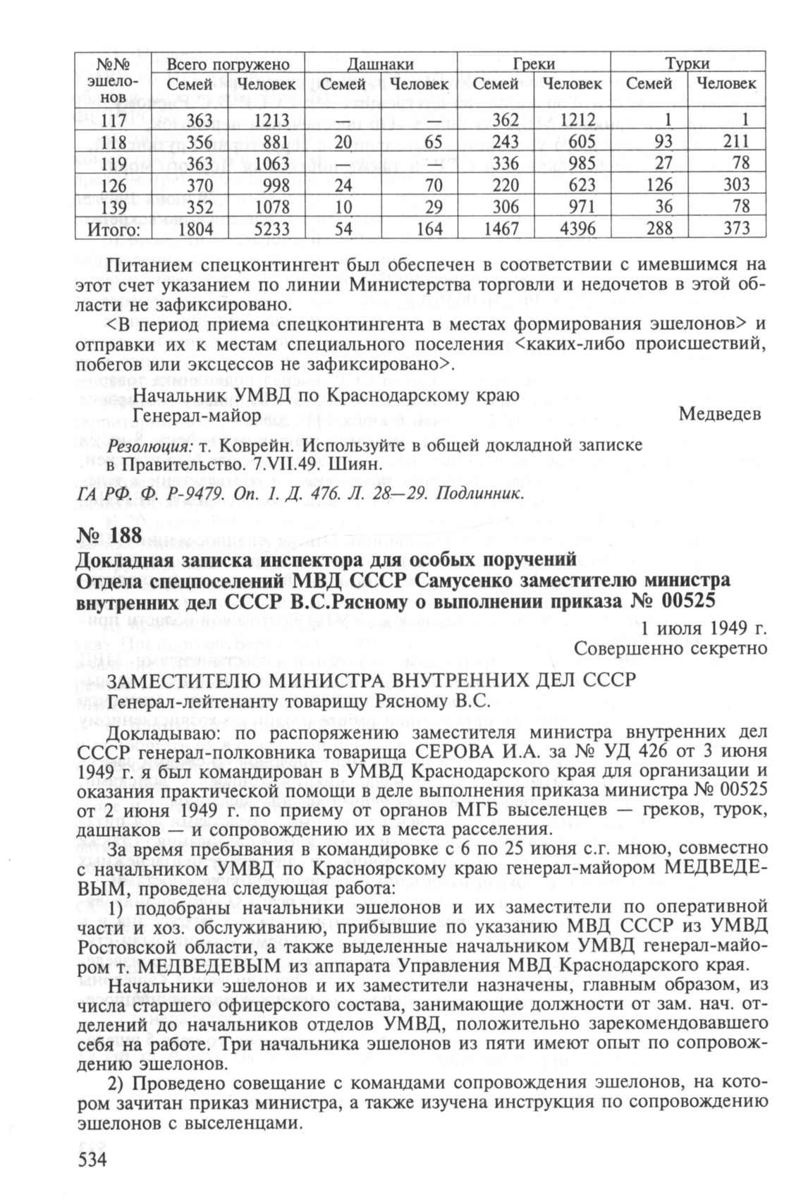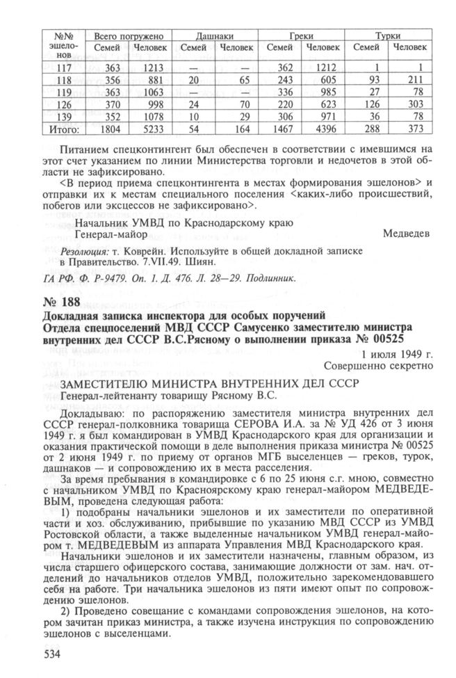 Докладная записка инспектора для особых поручений Отдела спецпоселений МВД СССР Самусенко заместителю министра внутренних дел СССР В. С. Рясному о выполнении приказа № 00525. 1 июля 1949 г. // ГА РФ. Ф. P-9479. Oп. 1. Д. 476. Л. 37—41. Подлинник.