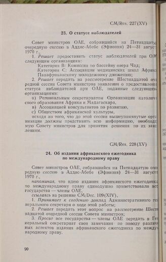Пятнадцатая очередная сессия Совета министров. CM/Res. 228 (XV). Об издании африканского ежегодника по международному праву. Аддис-Абеба, 24-31 августа 1970 г. // «OAU Secretariat. Resolutions, and Statements...», стр. 102--129.