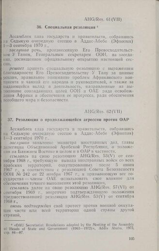 Седьмая очередная сессия Ассамблеи глав государств и правительств. AHG/Res. 62(VII). Резолюция о продолжающейся агрессии против ОАР. Аддис-Абеба, 1-3 сентября 1970 г. // «OAU Secretariat. Resolutions adopted by the Meeting of the Assembly of Heads of State and Government (1963-1972)», Addis Ababa, 1973, стр. 84-87.