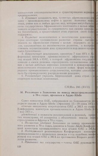 Семнадцатая очередная сессия Совета министров. CM/Res. 246 (XVII). Резолюция о Заявлении по поводу индустриализации в 70-х годах, принятом в Аддис-Абебе. Аддис-Абеба, 15-19 июня 1971 г. // «OAU Secretariat. Resolutions, Recommendations and Statements...», стр. 138-162.