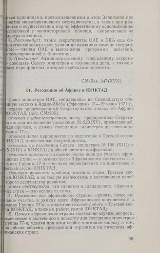 Семнадцатая очередная сессия Совета министров. CM/Res. 247 (XVII). Резолюция об Африке и ЮНКТАД. Аддис-Абеба, 15-19 июня 1971 г. // «OAU Secretariat. Resolutions, Recommendations and Statements...», стр. 138-162.