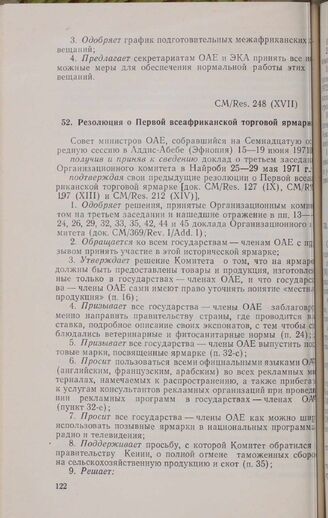 Семнадцатая очередная сессия Совета министров. CM/Res. 248 (XVII). Резолюция о Первой всеафриканской торговой ярмарке. Аддис-Абеба, 15-19 июня 1971 г. // «OAU Secretariat. Resolutions, Recommendations and Statements...», стр. 138-162.