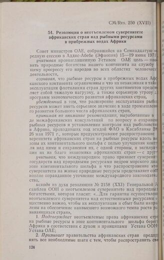 Семнадцатая очередная сессия Совета министров. CM/Res. 250 (XVII). Резолюция о неотъемлемом суверенитете африканских стран над рыбными ресурсами в прибрежных водах Африки. Аддис-Абеба, 15-19 июня 1971 г. // «OAU Secretariat. Resolutions, Recommendations and Statements...», стр. 138-162.