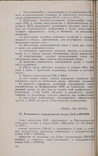 Восемнадцатая очередная сессия Совета министров. CM/Res. 263 (XVIII). Резолюция о сотрудничестве между ОАЕ и ПРООН. Аддис-Абеба, 14-19 февраля 1972 г. // «OAU Secretariat. Resolutions, Recommendations and Statements...», стр. 163-172.