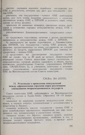 Восемнадцатая очередная сессия Совета министров. CM/Res. 264 (XVIII). Резолюция о проведении консультации между африканскими странами перед различными совещаниями неприсоединившихся государств. Аддис-Абеба, 14-19 февраля 1972 г. // «OAU Secretariat. Resolutions, Recommendations and Statements...», стр. 163-172.