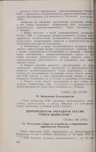 Восемнадцатая очередная сессия Совета министров. CM/Res. 265 (XVIII). Выражение благодарности. Аддис-Абеба, 14-19 февраля 1972 г. // «OAU Secretariat. Resolutions, Recommendations and Statements...», стр. 163-172.