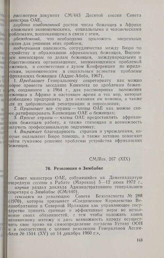 Девятнадцатая очередная сессия Совета министров. CM/Res. 267 (XIX). Резолюция о Зимбабве. Рабат, 5-12 июня 1972 г. // «OAU Secretariat. Resolutions, Recommendations...», стр. 173-218.