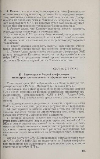 Девятнадцатая очередная сессия Совета министров. CM/Res. 276 (XIX). Резолюция о Второй конференции министров промышленности африканских стран. Рабат, 5-12 июня 1972 г. // «OAU Secretariat. Resolutions, Recommendations...», стр. 173-218.