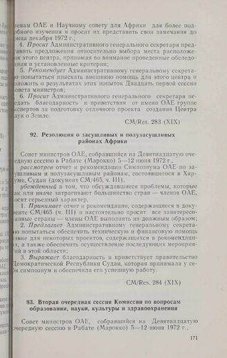 Девятнадцатая очередная сессия Совета министров. CM/Res. 283 (XIX). Резолюция о засушливых и полузасушливых районах Африки. Рабат, 5-12 июня 1972 г. // «OAU Secretariat. Resolutions, Recommendations...», стр. 173-218.
