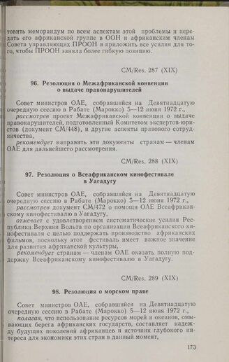 Девятнадцатая очередная сессия Совета министров. CM/Res. 289 (XIX). Резолюция о морском праве. Рабат, 5-12 июня 1972 г. // «OAU Secretariat. Resolutions, Recommendations...», стр. 173-218.