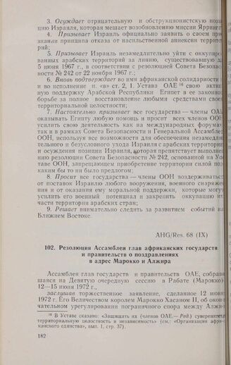 Девятая очередная сессия Ассамблеи глав государств и правительств. AHG/Res. 68 (IX). Резолюция Ассамблеи глав африканских государств и правительств о поздравлениях в адрес Марокко и Алжира. Рабат, 12-15 июня 1972 г. // «OAU Secretariat. Resolutions and Statements adopted by the Meetings of the Assembly of Heads of State and Government (1963-1972)», 1973, стр. 92-95.