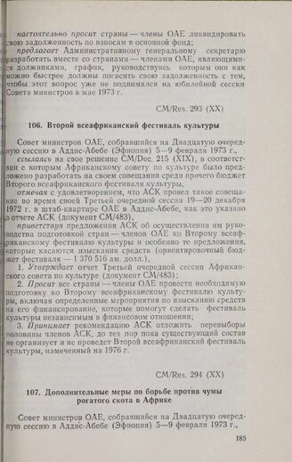 Двадцатая очередная сессия Совета министров. CM/Res. 293 (XX). Второй всеафриканский фестиваль культуры. Аддис-Абеба, 5-9 февраля 1973 г.