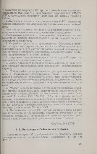 Двадцать первая очередная сессия Совета министров. CM/Res. 302 (XXI). Резолюция о Сейшельских островах. Аддис-Абеба, 17-24 мая 1973 г.
