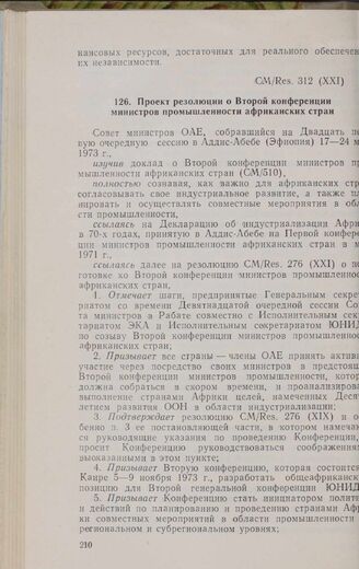 Двадцать первая очередная сессия Совета министров. CM/Res. 312 (XXI). Проект резолюции о Второй конференции министров промышленности африканских стран. Аддис-Абеба, 17-24 мая 1973 г. // «OAU Secretariat. Resolutions, Recommendations and Statements adopted by the Twenty-First Session of the Council of Ministers», Add Ababa, 1973.