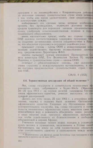 Двадцать первая очередная сессия Совета министров. CM/St. 9 (XXI). Торжественная декларация об общей политике. Аддис-Абеба, 17-24 мая 1973 г. // «OAU Secretariat. Resolutions, Recommendations and Statements adopted by the Twenty-First Session of the Council of Ministers», Add Ababa, 1973.