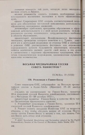 Восьмая чрезвычайная сессия Совета министров. ECM/Res. 19 (VIII). Резолюция о Гвинее-Бисау. Аддис-Абеба, 19-21 ноября 1973 г. // «OAU Secretariat. Resolutions and Declaration adopted by the Eighth Extraordinary Session of the Council of Ministers», Addis Ababa, 1973.