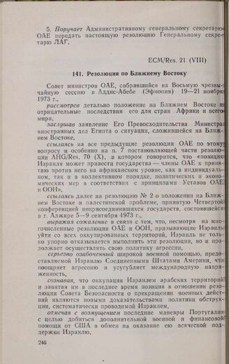 Восьмая чрезвычайная сессия Совета министров. ECM/Res. 21 (VIII). Резолюция по Ближнему Востоку. Аддис-Абеба, 19-21 ноября 1973 г. // «OAU Secretariat. Resolutions and Declaration adopted by the Eighth Extraordinary Session of the Council of Ministers», Addis Ababa, 1973.