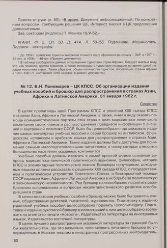 Б.Н. Пономарев - ЦК КПСС. Об организации издания учебных пособий и брошюр для распространения в странах Азии, Африки и Латинской Америки. 31 января 1962 г.