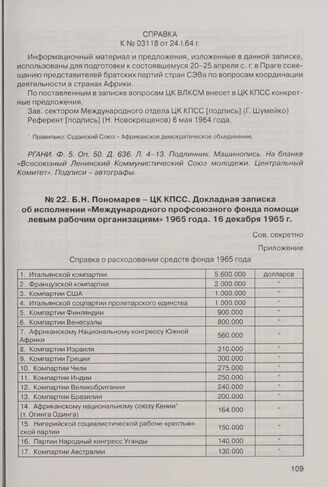 Б.Н. Пономарев - ЦК КПСС. Докладная записка об исполнении «Международного профсоюзного фонда помощи левым рабочим организациям» 1965 года. 16 декабря 1965 г. // РГАНИ. Ф. 89. Оп. 38. Д. 8. Л. 4-6. Подлинник. Машинопись и рукопись (цифры от руки).