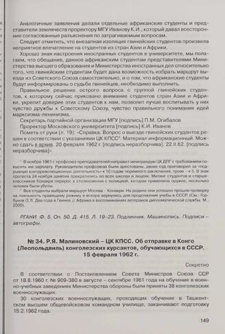 Р.Я. Малиновский - ЦК КПСС. Об отправке в Конго (Леопольдвиль) конголезских курсантов, обучающихся в СССР. 15 февраля 1962 г. // РГАНИ. Ф. 4. Оп. 18. Д. 73. Л. 114. Подлинник. Машинопись. Подпись - автограф.